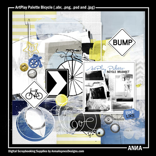 I used ArtPlay Palette Bicycle by Anna Aspnes Designs, which ended up being an excellent choice, since my layout was chosen as the inspiration for the current Anna Lift challenge!