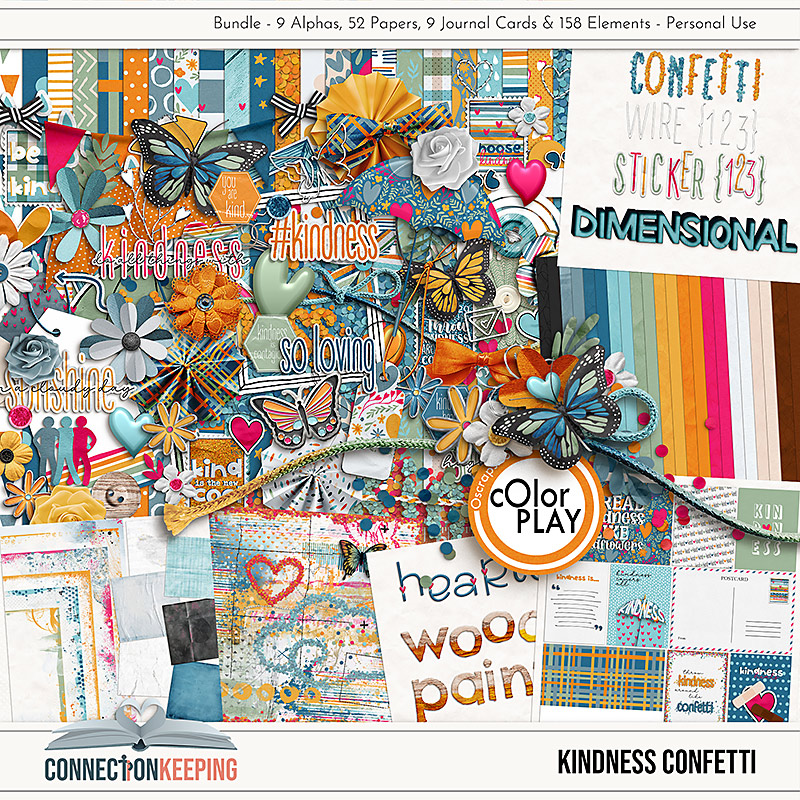 First I should note that it was Color Play time at Oscraps, and while the 50% off sale has ended, there is still a lot of goodness to check out. Here's a couple of layouts I made! I first worked with the awesome Kindness Confetti Bundle by Connection Keeping: